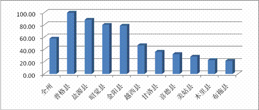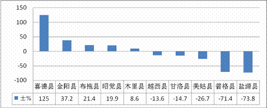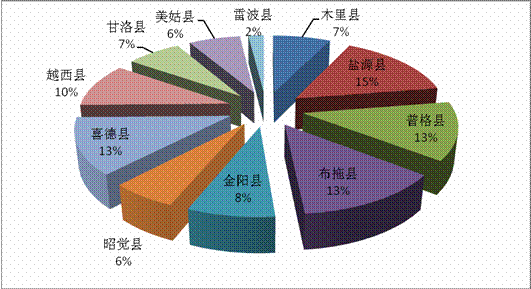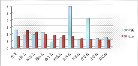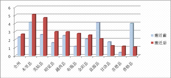 人均有耕地由搬迁前的2.52亩减少为搬迁后的1.62亩,减少35.7%。10个县(因雷波县仍在实施中未纳入统计。下同)中人均耕地减少的有5个县,增加的有5个县。其中减少幅度最大的是盐源县,由搬迁前的5.92亩减少为搬迁后的1.55亩,减少73.8%。由于盐源、普格等县搬迁数占全州总数的比重大(2县共占28%),且人均耕地减少幅度也大,导致全州人均耕地有较大幅度的减少。