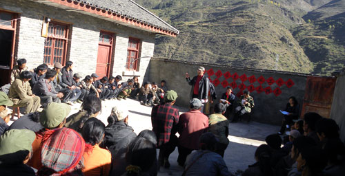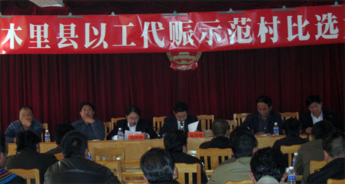 为做好木里县2011—2020年以工代赈新农村示范村规划前期工作,按照省以工代赈办公室陈华亨主任在凉山调研时提出“用十年时间(2011—2020年)在凉山建成100个以工代赈新农村示范村”的安排部署,根据省州以工代赈办关于以工代赈新农村示范村项目规划要求及“凉发改赈办(2009)782号《关于抓紧开展凉山州以工代赈示范村建设前期工作的通知》”精神,在通过初步调查的基础上,按照群众基础好、领导班子强、发展潜力大、示范效果好的准入条件,经县委县政府研究,初步确定乔瓦镇、瓦厂镇、李子坪乡等8个乡(镇)中的10个村参加示范村比选。2009年10月29日下午,在县政府四楼会议室召开示范村比选大会,会议由县政府常务副县长杨登明主持,与会人员为10个村代表,县政府办、县发改局等相关部门组成考评委员 会。
